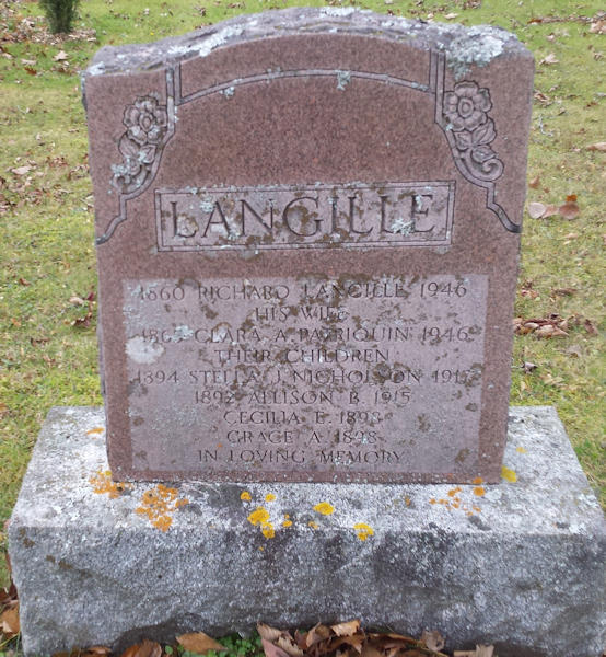 Parents Father: PATRIQUIN, Stewart McConnell Mother: MINGO, Mary Ann Birth Born on March 12, 1865 in Denmark, Colchester Co., NS Death Died on June 07, 1946 in Brule, Colchester Co., NS Buried in Middleton Corner Cemetery in Middleton, Colchester Co., NS Marriages LANGILLE, Richard Married on February 20, 1890 in River John, Pictou Co., NS Children LANGILLE, Leslie White: January 12, 1891 - December 30, 1964 LANGILLE, Allison B.: November 10, 1892 - March 13, 1915 LANGILLE, Stella M.: June 07, 1894 - October 27, 1917 LANGILLE, Marguerite Myrtle: April 14, 1896 - 1982 LANGILLE, Cecilia E.: 1898 - 1898 LANGILLE, Grace Ann: 1898 - 1898 LANGILLE, Brenton Haliburton: July 12, 1900 - October 25, 1977 LANGILLE, Eva Sophia: March 23, 1909 - June 16, 1990 Notes Death: Cerebral Hemorhage Sources Nova Scotia Deaths: Year 1946 Pg. 5734 Colchester Cemeteries: Middleton Corner Cemetery #44 Images Richard & Clara (Patriquin) Langille,Stella (Langille) Nicholson,Allison,Cecilia,Grace Langille