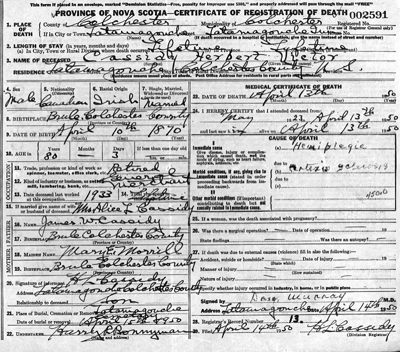 Birth Born on April 10, 1870 in Tatamagouche, Colchester Co., NS Death Died on April 13, 1950 in Tatamagouche, Colchester Co., NS Buried in Sharon United Cemetery in Tatamagouche, Colchester Co., NS Marriages BARNES, Alice Lawrence Married on October 24, 1893 in Malden, Middlesex Co., MA Children CASSIDY, Alice Maud: October 17, 1903 - April 18, 1998 Notes Occupation: Tailor/ Merchant Death: Hemiplegia Sources Nova Scotia Deaths: Year 1950 Pg. 2591 Colchester Cemeteries: Tatamagouche Sharon United Cemetery #140 Images Herbert Cassidy Birth Herbert & Alice (Barnes) Cassidy Herbert Cassidy Death Herbert Cassidy Marriage