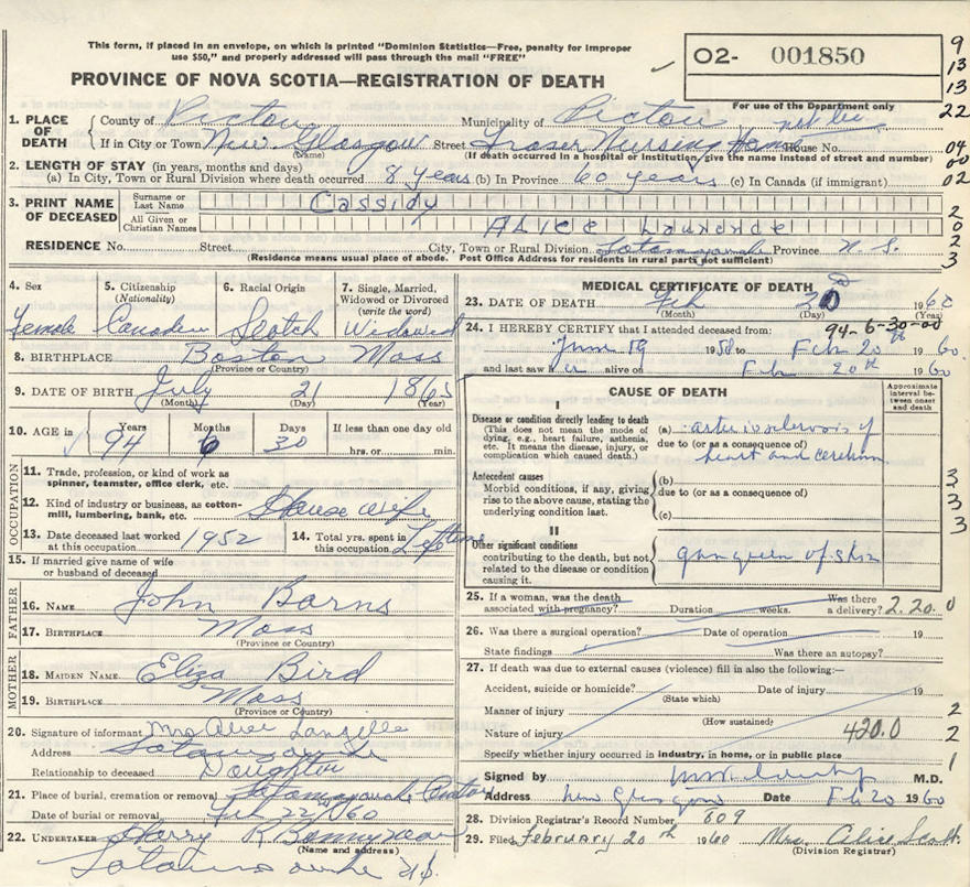 Birth Born on July 21, 1866 in Boston, Suffolk Co., MA Death Died on February 20, 1960 in New Glasgow, Pictou Co., NS Buried in Sharon United Cemetery in Tatamagouche, Colchester Co., NS Marriages CASSIDY, Herbert Victor Married on October 24, 1893 in Malden, Middlesex Co., MA Children CASSIDY, Alice Maud: October 17, 1903 - April 18, 1998 Notes Death: Arteriosclerosis Occupation: Saleswoman Sources Colchester Cemeteries: Tatamagouche Sharon United Cemetery #140 Nova Scotia Deaths: Year 1960 Pg. 1850 Images Alice Barnes Birth Herbert & Alice (Barnes) Cassidy Alice (Barnes) Cassidy Death Herbert Cassidy Marriage