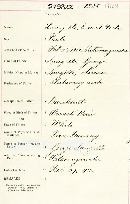 Parents Father: LANGILLE, George Mother: LANGILLE, Susan Birth Born on February 27, 1912 in Tatamagouche, Colchester Co., NS Death Died on 1990 in Truro, Colchester Co., NS Buried in Lockerby Memorial Cemetery in Tatamagouche, Colchester Co., NS Marriages MACDONALD, Marie Elizabeth Married on July 06, 1938 in Tatamagouche, Colchester Co., NS Children LANGILLE, George Gordon: 1940 - December 29, 2003 LANGILLE, Carolyn Marie: December 30, 1944 LANGILLE, Brenda Joan: July 30, 1953 Notes Occupation: Telegraph Operator/ Partner in Langille Bros. Automobile Dealership Sources Colchester Cemeteries: Lockerby Memorial Cemetery Tatamagouche,NS Images Hector Langille Birth Hector & Marie (MacDonald) Langille Hector Langille Marriage