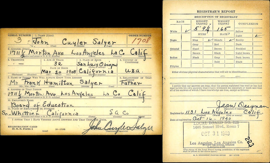 Birth Born on March 20, 1908 in San Luis Obispo Co., CA Death Died on March 26, 1984 in Orange Co., CA Marriages HOWDEN, Margaret Jessie Married on September 23, 1938 in Santa Monica, Los Angeles Co., CA Notes Occupation: Teacher/ Ptrincipal Military Service: WW2 US Army Images John Salyer WW2 Draft Margaret Howden Marriage