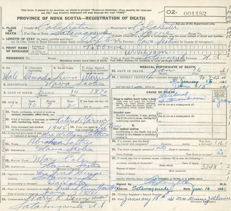 Parents Father: TATTRIE, Abraham Mother: COLE, Mary Birth Born on June 14, 1870 in Tatamagouche, Colchester Co., NS Death Died on January 16, 1961 in Tatamagouche, Colchester Co., NS Buried in French River Cemetery in French River, Colchester Co., NS Marriages MACPHERSON, Margaret Jane Married on January 26, 1894 in Tatamagouche, Colchester Co., NS Children TATTRIE, Margaret Clark: March 30, 1902 - January 06, 2001 Notes Occupation: Farmer Death: Cerebral Arteriosclerosis Sources Nova Scotia Deaths: Year 1961 Pg. 1182 Images Abraham & Mary (Cole) & James W. & Margaret (MacPherson) Tattrie Abraham & Mary (Cole) Tattrie & James W. & Margaret (MacPherson) Tattrie James Tattrie Death James Tattrie Marriage
