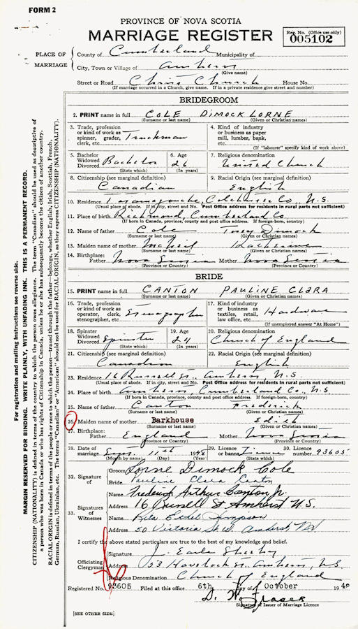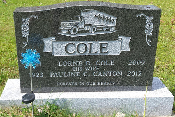Parents Father: COLE, Dimock Torry Mother: McNEIL, Katherine Morris Birth Born on November 29, 1921 in Wallace Highlands, Cumberland Co., NS Death Died on June 15, 2009 in Truro, Colchester Co., NS Buried in Lockerby Memorial Cemetery in Tatamagouche, Colchester Co., NS Marriages CANTON, Pauline Clara Married on September 11, 1948 in Amherst, Cumberland Co., NS Children COLE, Loreen Paulette COLE, Frederick COLE, Kim Notes Occupation: Truckman/ Owner Cole's Transfer Ltd. Obituary: Cole, Lorne D. - 87, Truro Heights passed away peacefully June 15, 2009 in Colchester Regional Hospital, Truro. Born in Richmond, Cumberland County on November 29, 1921, he was a son of the late Dimock and Kate (MacNeil) Cole. Lorne started working in the woods in his early teens before he worked in the trucking business. He purchased a small business and built it into Cole's Transfer Limited, a major employer in Tatamagouche during the 1960's, later relocating to North River. His business expanded over mainland Nova Scotia and New Brunswick where he operated it until it was sold to Speedway Transport in the early seventies. Lorne was a member of Sharon United Church, Tatamagouche and served as a volunteer member of the Tatamagouche Fire Department and a founding member of the North River Fire Brigade. He was a Nova Scotia Hunting Guide for over 50 years developing lifelong friendships with his American friends. He spent his leisure time fishing in Nova Scotia and taking legendary fishing trips to Newfoundland. Lorne is survived by his wife of 60 years, Pauline (Canton) Cole; children, Loreen (George W.) MacNutt, Truro Heights, Fred (Richard Corteel), Truro, Kim (Lynn MacKinnon), Bible Hill; grandchildren, Peter MacNutt (Kim), Cambridge, Ont., Patti Barkhouse (Doug), Lower Onslow, Danny MacNutt (Becky), Onslow Mountain, Justin and Jeremy Cole, Bible Hill; great-grandchildren, Kayla and Jenna MacNutt, Morgan and Cole Barkhouse, Nathaniel MacNutt; sisters, Marie Sinclair (Edgar), Goshen, Hazel Miller, Bible Hill, Cecilia Graham, Hamilton, Ont.; several nieces and nephews. He was predeceased by sisters, Lula, Katherine and Florence; brothers, Roy and Morris. Cremation has taken place. A Memorial Service will take place on Saturday, June 20th at 1:00 pm in Colchester Community Funeral Home, 512 Willow Street, Truro. Reception to follow the service. A private family interment will take place in Lockerby Cemetery, Tatamagouche. Family flowers only. Donations in Lorne's memory may be made to the North River Fire Brigade or a charity of choice. On-line condolences may be made at www.colchestercommunity.com Sources Funeral Home: Colchester Community Funeral Home Truro,NS Obituary June 2009 Images Lorne Cole Birth Lorne & Pauline (Canton) Cole Lorne Cole Marriage Lorne Cole