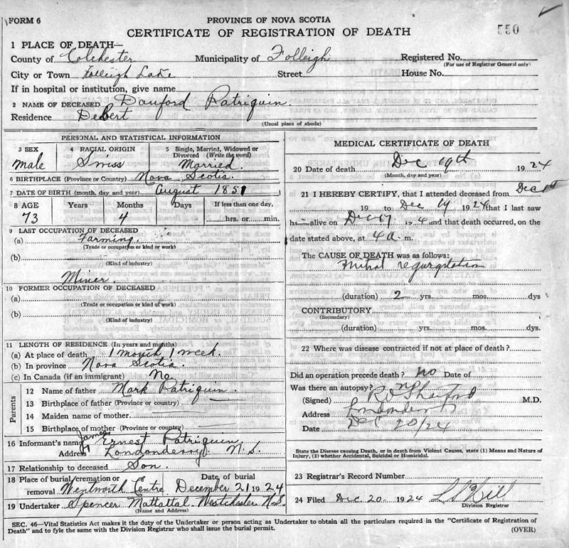 Parents Father: PATRIQUIN, Mark Mother: MATTATALL, Mary Elizabeth Birth Born on July 25, 1853 in Tatamagouche, Colchester Co., NS Death Died on December 19, 1924 in Folly Lake, Colchester Co., NS Buried in United Church Cemetery in Wentworth, Cumberland Co., NS Marriages TOTTEN, Martha Jane Married on October 22, 1875 in Londonderry, Colchester Co., NS Children PATRIQUIN, Ira Bordon: November 08, 1878 - August 16, 1924 Notes Occupation: Miner/ Farmer Death: Mitral Regurgitation Sources Nova Scotia Deaths: Book 112 Pg. 550 Images Danford Patriquin Danford Patriquin Death Danford Patriquin Marriage