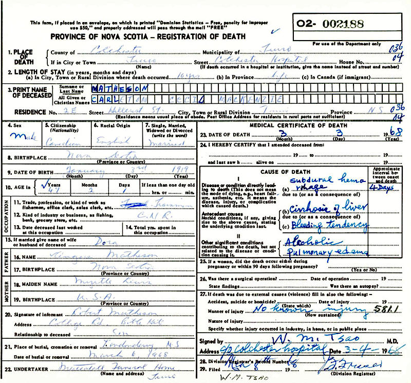 Birth Born on January 03, 1919 in Five Islands, Colchester Co., NS Death Died on March 03, 1968 in Truro, Colchester Co., NS Buried in Hillside Cemetery in Londonderry, Colchester Co., NS Marriages PATRIQUIN, Dora Gladys Children MATHESON, Truman MATHESON, Gary MATHESON, Glenn MATHESON, Randy MATHESON, Robin MATHESON, Robert Carleton: February 25, 1937 - June 11, 2019 Notes Occupation: Canadian National Railway Death: Subdural Hemorhage/ Cirrhosis of Liver Sources Nova Scotia Deaths: Year 1968 Pg. 2188 Colchester Cemeteries: Londonderry Hillside Cemetery #246 Images Carlton Matheson Birth Carleton Matheson Death