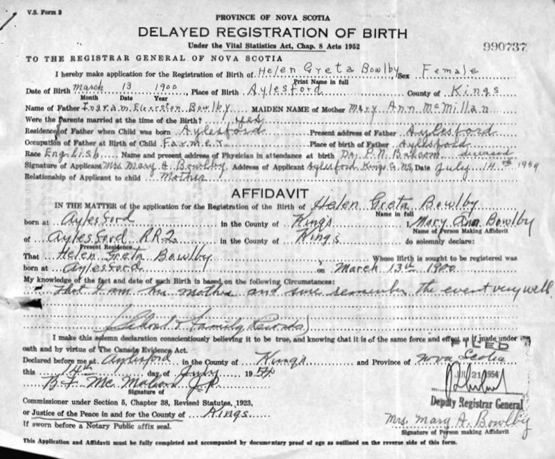 Parents Father: BOWLBY, Ingram Elverson Mother: McMILLAN, Mary Ann Birth Born on March 13, 1900 in Aylesford, Kings Co., NS Death Died on August 01, 1998 in Kings Co., NS Buried in Aylesford Union Cemetery in Aylesford, Kings Co., NS Marriages OGILVIE, Charles Spurgeon Married on December 03, 1919 in Weltons Corner, Kings Co., NS Children OGILVIE, Theodore Ingram: September 11, 1920 - August 11, 1979 OGILVIE, Harry Merrill: October 18, 1922 OGILVIE, Charles Loring: 1925 - 1980 OGILVIE, Donald Elverson: April 20, 1933 - January 07, 2024 Sources Kings Cemetery Records: Aylesford Union Cemetery Images Helen Bowlby Birth Charles & Helen (Bowlby) Ogilvie Helen Bowlby Marriage