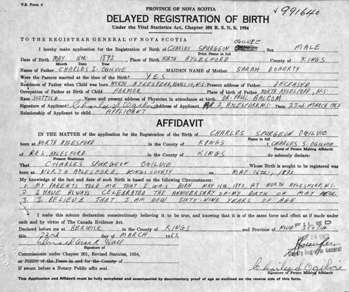 Parents Father: OGILVIE, Charles I. Mother: DOHERTY, Sarah Jane Birth Born on May 16, 1892 in North Aylesford, Kings Co., NS Death Died on August 14, 1977 in Kings Co., NS Buried in Aylesford Union Cemetery in Aylesford, Kings Co., NS Marriages BOWLBY, Helen Greta Married on December 03, 1919 in Weltons Corner, Kings Co., NS Children OGILVIE, Theodore Ingram: September 11, 1920 - August 11, 1979 OGILVIE, Harry Merrill: October 18, 1922 OGILVIE, Charles Loring: 1925 - 1980 OGILVIE, Donald Elverson: April 20, 1933 - January 07, 2024 Notes Occupation: Farmer Sources Kings Cemetery Records: Aylesford Union Cemetery Images Charles Ogilvie Birth Charles & Helen (Bowlby) Ogilvie Helen Bowlby Marriage