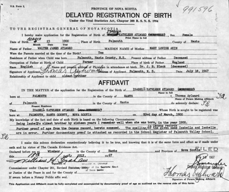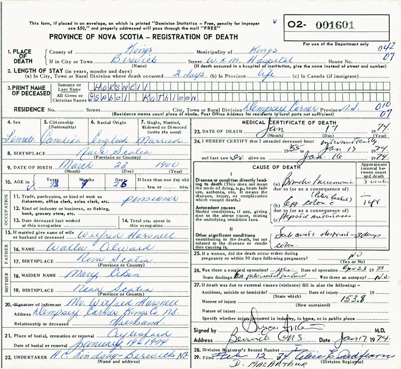 Parents Father: AYLWARD, Walter James Mother: AKIN, Mary Louise Birth Born on March 23, 1900 in Falmouth, Hants Co., NS Death Died on January 17, 1974 in Berwick, Kings Co., NS Buried in Aylesford Union Cemetery in Aylesford, Kings Co., NS Marriages HORSNELL, Wilfred Freeman Married on September 26, 1928 in Falmouth, Hants Co., NS Children HORSNELL, Mary Louise: November 30, 1930 - February 04, 2021 HORSNELL, Laurie Victor: May 23, 1933 - April 18, 2022 HORSNELL, Eric Aylward: June 21, 1942 - June 07, 2004 HORSNELL, Clyde Sands: May 16, 1944 - July 29, 2010 Notes Death: Bronchopneumonia/ Colon Carcinoma Sources Nova Scotia Deaths: Year 1974 #1601 Images Isabell Aylward Birth Isabell (Aylward) Horsnell Death
