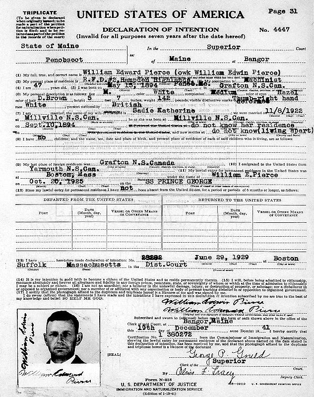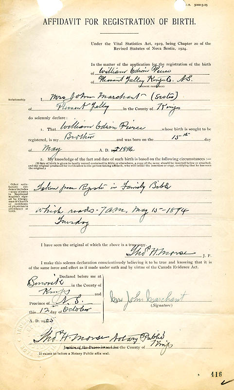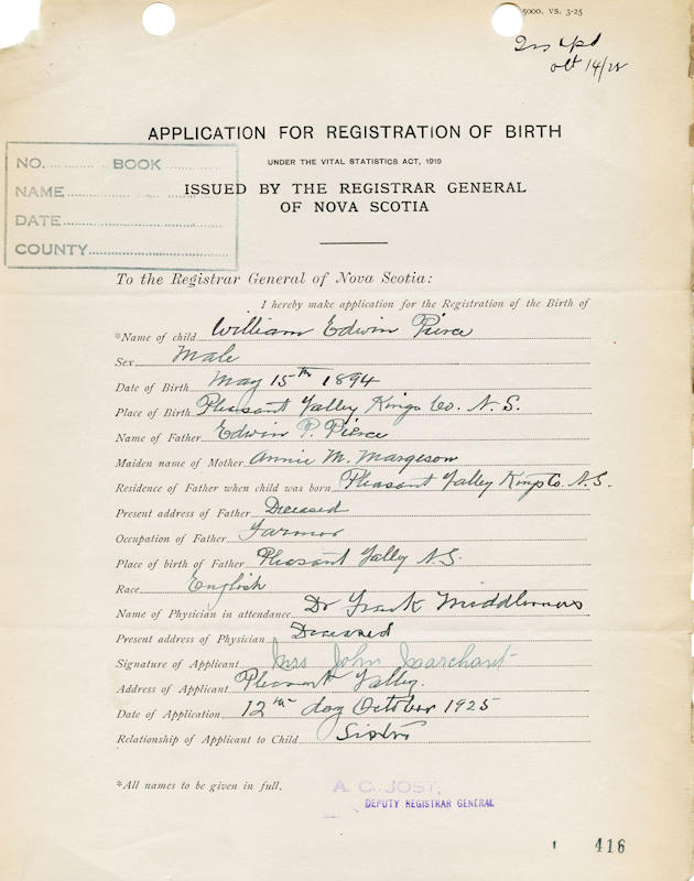 Parents Father: PIERCE, Edwin Parker Mother: MARGESON, Anne Birth Born on May 15, 1894 in Pleasant Valley, Kings Co., NS Death Died on 1969 in Grafton, Grafton Co., NH Buried in Valley Cemetery in Lebanon, Grafton Co., NH Marriages PALMER, Sadie Katherine Married on November 08, 1922 in Millville, Kings Co., NS Notes Occupation: Farmer/ Machinist Images William Pierce Birth Affidavit William Pierce Birth William Pierce Sadie Palmer Marriage William Pierce Naturalization