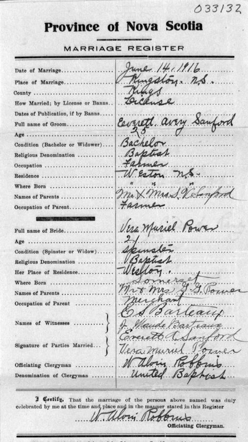 Parents Father: SANFORD, Seldon Vicars Mother: SHAW, Love Minetta Birth Born on March 14, 1891 in Weston, Kings Co., NS Death Died on May 23, 1971 in Weston, Kings Co., NS Buried in Berwick Cemetery in Berwick, Kings Co., NS Marriages POWER, Vera Muriel Married on June 14, 1916 in Kingston, Kings Co., NS Children SANFORD, Marion Elizabeth: August 04, 1922 - March 01, 2014 SANFORD, Audrey Marguerite: October 14, 1926 - December 04, 2015 Notes Occupation: Farmer Death: Myocardial Infarction Sources Nova Scotia Deaths: Year 1971 #3600 Images Everett Sanford Death Everett Power Marriage