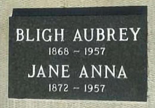 Parents Father: BLIGH, Everett Mother: ROCKWELL, Adelaide Harriet Birth Born on June 07, 1869 in Wolfville, Kings Co., NS Death Died on November 20, 1957 in Rocanville, Melville Census Division, SK Buried in Webster Cemetery in Rocanville, Melville Census Division, SK Marriages ABERNATHY, Jane Anna Married on March 31, 1909 in Langenberg, Melville Census Division, SK Children BLIGH, Everett Rockwell: January 24, 1910 - 1984 BLIGH, Albert Alexander Aubrey: April 16, 1911 - June 05, 1996 BLIGH, Arthur Herbert: December 04, 1912 - 1995 BLIGH, Georgia Adelaide: 1914 - November 21, 2004 BLIGH, Susannah Elizabeth: 1916 Notes Occupation: Farmer Images Aubrey & Jane (Abernathy) Bligh Aubrey & Jane (Abernathy) Bligh