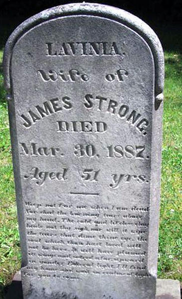 Birth Born on 1835 Death Died on March 30, 1887 in Kings Co., NS Buried in Cambridge United Baptist Cemetery in Cambridge Station, Kings Co., NS Marriages STRONG, James Manning Married on October 31, 1863 Children STRONG, Adelbert Havelock: January 12, 1864 - August 07, 1950 STRONG, Clara Bell: March 19, 1872 - 1975 Sources Kings Cemetery Records: Cambridge Cemetery Images Lavinia (Webster) Strong