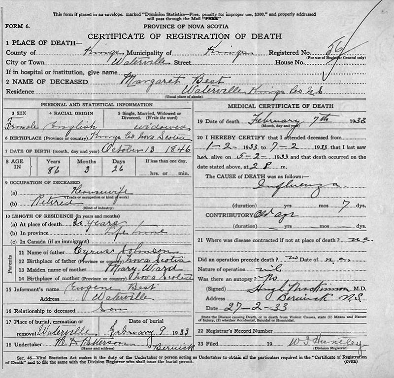 Birth Born on October 13, 1846 in Cornwallis, Kings Co., NS Death Died on February 07, 1933 in Waterville, Kings Co., NS Buried in Waterville United Cemetery in Waterville, Kings Co., NS Marriages BEST, Burpee Richard Married on May 27, 1874 in Kentville, Kings Co., NS Children BEST, Ada Beatrice: August 07, 1879 - July 20, 1964 Notes Death: Influenza Sources Nova Scotia Deaths: Book 148 Pg. 56 Images Burpee & Margaret (Johnson) Best Margaret (Johnson) Best Death Burpee Best Marriage