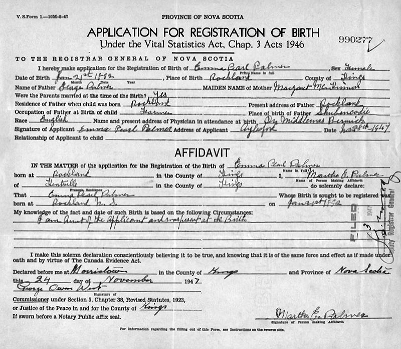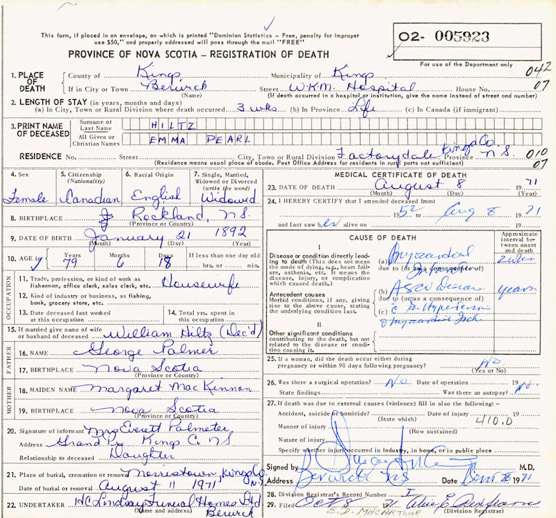 Parents Father: PALMER, George Mother: McKINNON, Margaret Birth Born on January 21, 1892 in Rockland, Kings Co., NS Death Died on August 08, 1971 in Berwick, Kings Co., NS Buried in Morristown Cemetery in Morristown, Kings Co., NS Marriages HILTZ, William Isaac Children HILTZ, Margaret HILTZ, Arthur Frank: April 12, 1913 - April 01, 1924 HILTZ, Harley Palmer: December 27, 1920 - 1985 HILTZ, Jean Albina: 1928 - February 29, 2016 Notes Death: Myocardial Infarction Sources Nova Scotia Deaths: Year 1971 #5923 Images Emma Palmer Birth William & Emma (Palmer) hiltz Emma (Palmer) Hiltz Death