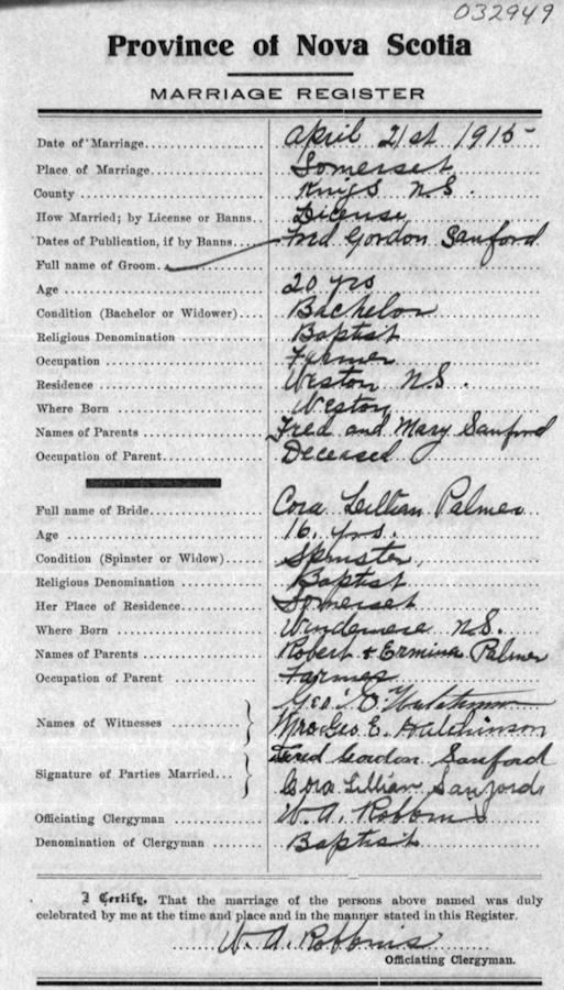 Parents Father: PALMER, Robert Bordman Mother: RAINFORTH, Ermina Anna Birth Born on August 09, 1898 in Windermere, Kings Co., NS Death Died on February 12, 1983 in Berwick, Kings Co., NS Buried in Berwick Cemetery in Berwick, Kings Co., NS Marriages SANFORD, Frederick Gordon Married on April 21, 1915 in Somerset, Kings Co., NS Children SANFORD, Dorothy Bernice: December 31, 1916 - September 22, 1996 SANFORD, Robert Ivan: March 16, 1920 - January 19, 1999 SANFORD, Frederick Gordon: August 03, 1921 - January 28, 1996 Images Frederick & Cora (Palmer) & Michael Sanford Cora Palmer Marriage Frederick & Cora (Palmer) Sanford