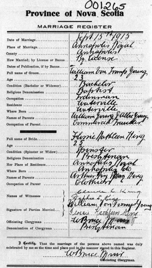 Parents Father: YOUNG, William Admiral Von Tromp Mother: SHAW, Abbie Louisa Birth Born on July 17, 1892 in Waterville, Kings Co., NS Death Died on April 29, 1974 in Berwick, Kings Co., NS Buried in Berwick Cemetery in Berwick, Kings Co., NS Marriages WOLLARD, Elsie Lilah (Crosby) Married on October 02, 1924 in Yarmouth, Yarmouth Co., NS KING, Flossie Kathleen Married on September 15, 1915 in Annapolis Royal, Annapolis Co., NS Children YOUNG, William Arthur: August 06, 1918 - February 04, 2002 Notes Occupation: Train Conductor Death: Cancer Sources Nova Scotia Deaths: Year 1974 #3242 Images William Young Birth William & Elsie (Wollard) Young William Young Death William Young Jr Marriage William Young Jr Marriage2