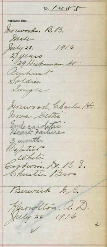 Parents Father: NORWOOD, Charles Hubert Mother: KNOWLTON, Abi Achsah Birth Born on May 26, 1888 in Berwick, Kings Co., NS Death Died on July 23, 1916 in Amherst, Cumberland Co., NS Buried in Berwick Cemetery in Berwick, Kings Co., NS Notes Occupation: WW1 Soldier Death: Endocarditis Heart Failure Sources Nova Scotia Deaths: Book 41 Pg. 359 #1455 Images Basil Norwood Death