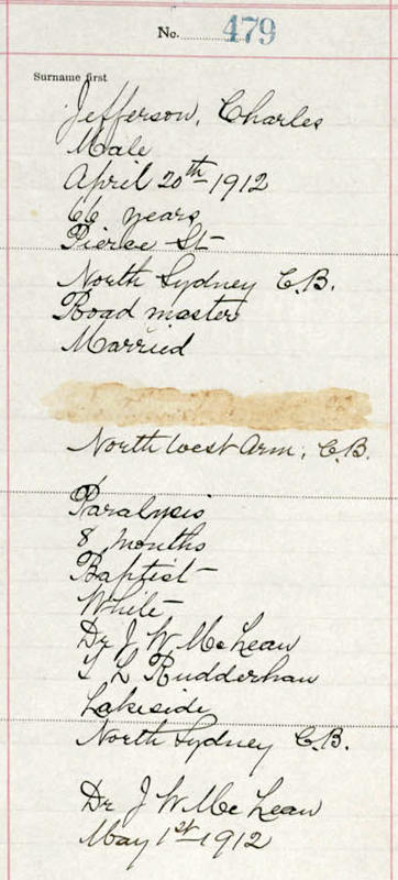 Parents Father: JEFFERSON, Joseph Luis Mother: LEAVER, Eliza Birth Born on May 15, 1844 in North Sydney, Cape Breton Co., NS Death Died on April 20, 1912 in North Sydney, Cape Breton Co., NS Buried in Lakeside Cemetery in North Sydney, Cape Breton Co., NS Marriages NORWOOD, Anne Shaw Married on November 13, 1872 in North Sydney, Cape Breton Co., NS Notes Occupation: Road Master Death: Paralysis Sources Nova Scotia Deaths: Book 22 Pg. 80 #479 Images Charles Jefferson Charles Jefferson Death