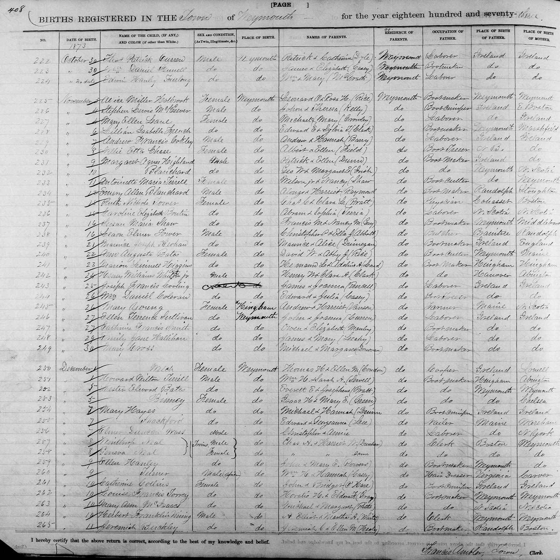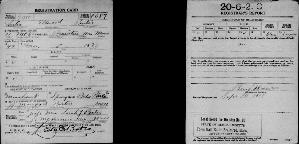 Birth Born on December 05, 1873 in Weymouth, Norfolk Co., MA Death Died on March 17, 1946 in Weymouth, Norfolk Co., MA Buried in Mount Hope Cemetery in Weymouth, Norfolk Co., MA Marriages REA, Sara Jane Married on June 26, 1895 in Weymouth, Norfolk Co., MA Children BATES, Davis Remele: October 13, 1902 - June 27, 1984 Notes Occupation: Operative/ Furniture Salesman/ Dealer Heaters/ Wholesales Ranges & Heaters Sources Massachusetts Cemeteries: Mount Hope Cemetery Weymouth,MA Images Lester Bates Birth Lester & Sarah (Rea) Bates Lester Bates WW1 Draft Lester Bates Marriage