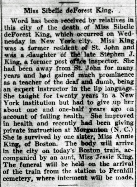 Parents Father: KING, Stephen James Mother: KNOWLES, Anna Sneddon Birth Born on June 25, 1874 in Saint John, Saint John Co., NB Death Died on February 22, 1922 in Ashville, Buncombe Co., NC Buried in Fernhill Cemetery in Saint John, Saint John Co., NB Notes Occupation: Teacher of Deaf North Carolina School for Deaf Death: Myocardial Degeneration Historical Information: Miss WOODBRIDGE, d/o the principal of the deaf and dumb school at Fredericton and Sibelle KING d/o S.J. KING have returned from Northampton, Mass. where they have been taking a special course of instruction at the Clark institution. The young ladies have received diplomas qualifying them as teachers. Miss Woodbridge will assist next year in the Fredericton school at Hawthorn Hill, while Miss King will go to Montreal where she had been engaged to take charge of the branch of oral instruction at the McKay institution. The Daily Telegraph Saint John,NB July 8,1895 Sources North Carolina Deaths: #107 Images Sibelle King Obit