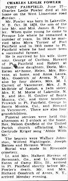 Parents Father: FOWLER, James Rulofson Mother: DEFOREST, Anne Matilda Birth Born on October 28, 1878 in Lakeville, Carleton Co., NB Death Died on June 25, 1944 in Fort Fairfield, Aroostook Co., ME Buried in Riverside Cemetery in Fort Fairfield, Aroostook Co., ME Marriages TURNER, Myra Hope Married on February 07, 1914 in Fort Fairfield, Aroostook Co., ME Children FOWLER, George T.: August 17, 1915 - October 01, 1998 FOWLER, Doris E.: February 16, 1917 - February 13, 2006 FOWLER, Howard Leslie: August 25, 1918 - September 14, 2010 FOWLER, Helen Lettie: August 25, 1918 - February 25, 2010 FOWLER, Anna Laura: March 31, 1920 - June 30, 1995 FOWLER, Robert Churchill: July 12, 1921 - January 03, 1992 Notes Occupation: Farmer Sources Mormons: 7909901 Images Myrtle Fowler & Siblings Birth Charles Fowler Birth Charles Fowler Charles Fowler Obit Charles Fowler