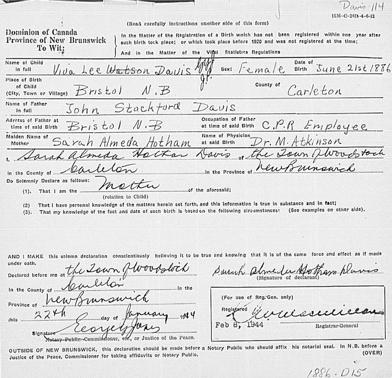 Parents Father: DAVIS, John Stockford Mother: HOTHAM, Sarah Almeda Birth Born on June 21, 1886 in Bristol, Carleton Co., NB Death Died on 1983 Buried in Woodstock Rural Cemetery in Woodstock, Carleton Co., NB Marriages WATSON, Harleigh Ballentyne Married on January 04, 1905 in Carleton Co., NB Children WATSON, Wendell Davis: April 03, 1905 - 1960 WATSON, Russell Alward: July 26, 1906 - April 20, 1989 WATSON, Sara Evelyn: November 23, 1912 - 1998 Sources NB Cemeteries: Woodstock Rural Cemetery Woodstock,NB Images Viva Davis Birth Viva (Davis) Watson Harleigh Watson Marriage