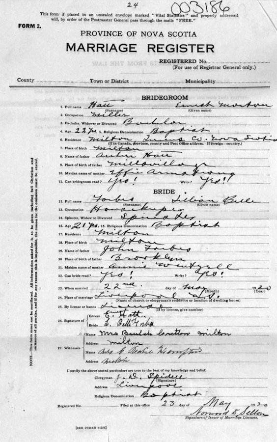 Parents Father: HATT, Arthur Crawley Mother: ARMSTRONG, Effie Flora Margaret Birth Born on July 22, 1898 in Milton, Queens Co., NS Death Died on June 24, 1927 in Weymouth, Digby Co., NS Buried in Milton Community Cemetery in Milton, Queens Co., NS Marriages FORBES, Lillian Belle Married on May 22, 1920 in Liverpool, Queens Co., NS Children HATT, Russell Morton: July 18, 1921 Notes Occupation: Mill Worker Death: Tuberculosis/ Addisons Disease Sources Nova Scotia Deaths: Book 121 Pg. 120 Images Ernest Hatt Birth Ernest Hatt Ernest Hatt Death Ernest Hatt Marriage