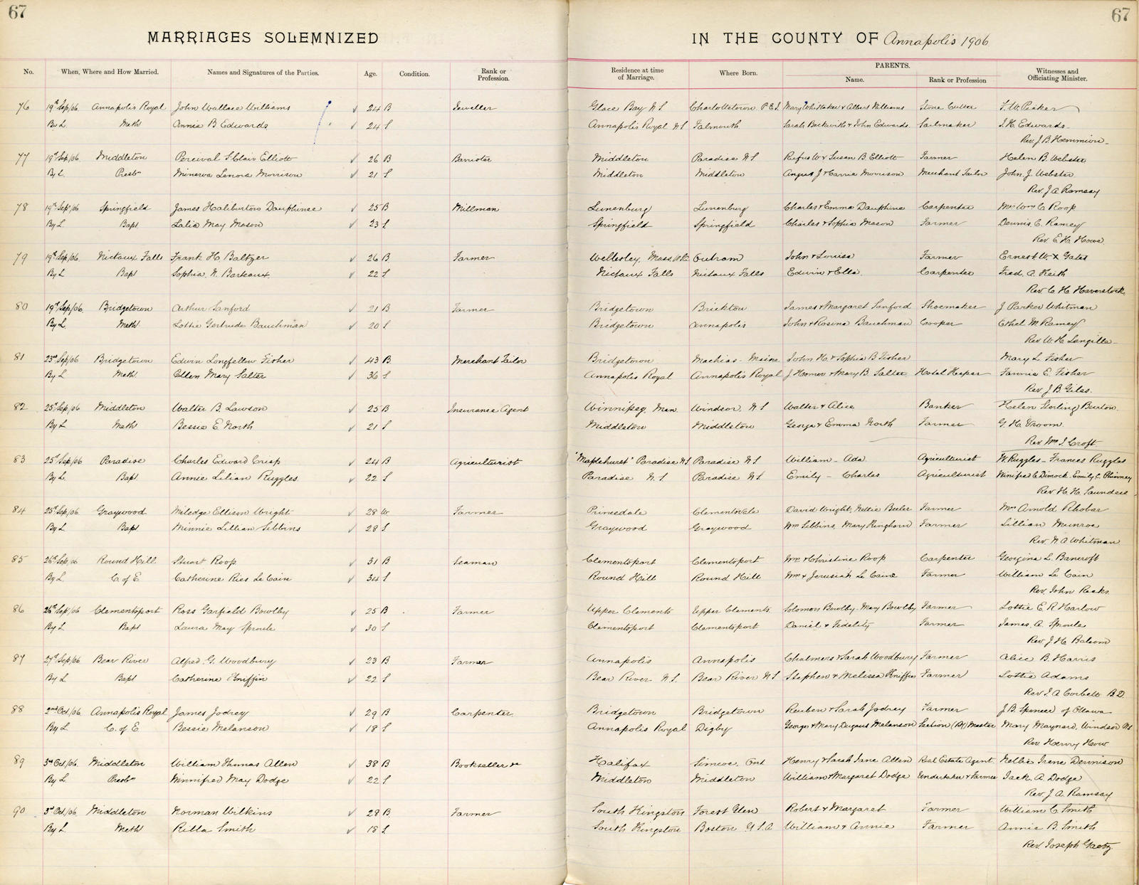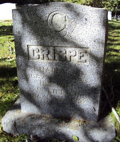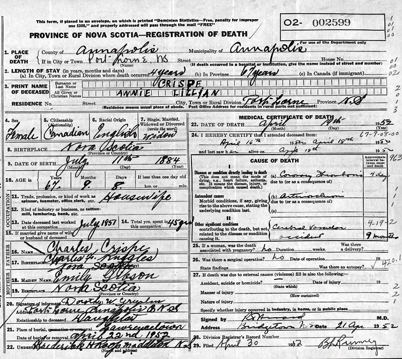 Birth Born on July 11, 1884 in Paradise, Annapolis Co., NS Death Died on April 19, 1952 in Port Lorne, Annapolis Co., NS Buried in Fairview Cemetery in Lawrencetown, Annapolis Co., NS Marriages CRISPE, Charles Edward Married on September 25, 1906 in Paradise, Annapolis Co., NS Children CRISPE, Frances Lillian: April 29, 1907 CRISP, Thornton Ruggles: January 10, 1909 CRISP, Dorothy Winifred: August 08, 1910 CRISPE, Mildred Vivian: September 04, 1912 - December 21, 1912 CRISPE, Violet Bernice: January 22, 1914 - October 23, 1916 Notes Death: Coronary Thrombosis Sources Nova Scotia Deaths: Book 1952 Pg. 2599 Annapolis Cemetery Records: Lawrencetown Fairview Cemetery #284 Images Charles & Annie (Ruggles) Crispe Annie (Ruggles) Crispe Death Charles Crispe Marriage Annie Ruggles