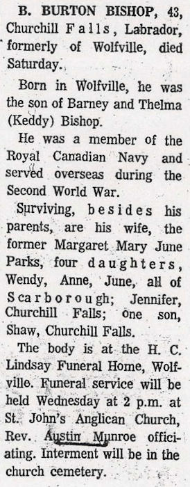 Parents Father: BISHOP, Barney Shaw Mother: KEDDY, Thelma Florence Birth Born on January 14, 1925 in Wolfville, Kings Co., NS Death Died on September 02, 1968 in Churchill Falls, Labrador, NL Buried in Saint Johns Anglican Cemetery in Wolfville, Kings Co., NS Marriages FRASER, Maura MacGregor Married on April 25, 1945 in Halifax, Halifax Regional Municipality, NS Divorced in 1957 Children BISHOP, Anne BISHOP, June BISHOP, Jennifer BISHOP, Shaw BISHOP, Wendy Gail: September 21, 1948 - May 24, 1988 Notes Military Service: WW2 RC Navy Sources Kings Cemetery Records: Saint Johns Anglican Cemetery Wolfville,NS Images Barney & Thelma (Keddy) & Barney B. Bishop Barney B. Bishop Marriage Barney Bishop Enlistment Notice Barney Bishop Obit