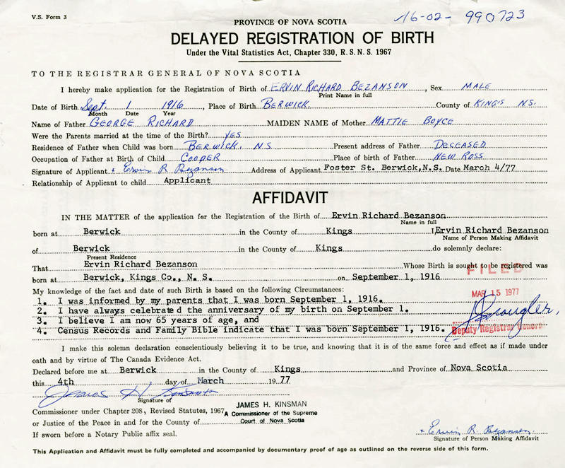 Parents Father: BEZANSON, George Richard Mother: SANFORD, Mattie Boyce Birth Born on September 01, 1916 in Berwick, Kings Co., NS Death Died on September 01, 1986 in Kings Co., NS Buried in Berwick Cemetery in Berwick, Kings Co., NS Marriages SANFORD, Dorothy Bernice Married on June 12, 1936 in Weston, Kings Co., NS Children BEZANSON, Lillian Boyce: January 30, 1937 - June 08, 1940 Notes Occupation: Truckman Sources Findagrave.com: https://www.findagrave.com/memorial/199108206/ervin_richard-bezanson Images Ervin Bezanson Birth Ervin Bezanson Marriage