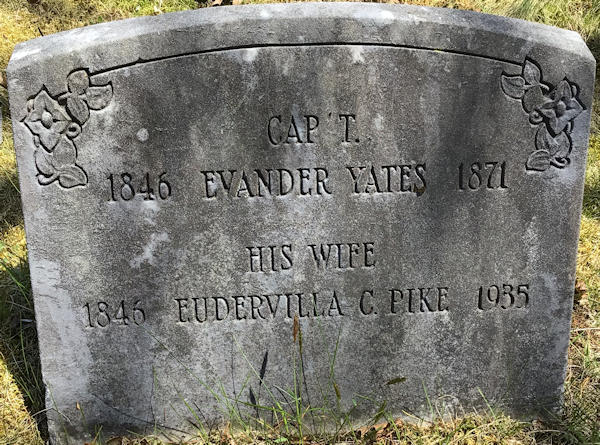 Birth Born on December 03, 1845 in Bristol, Lincoln Co., ME Death Died on 1935 in Roslindale, Suffolk Co., MA Buried in Chamberlain Cemetery in Round Pond, Lincoln Co., ME Marriages PIKE, Willard Franklin Married on December 25, 1872 in West Roxbury, Suffolk Co., MA Children PIKE, Osborne Buffum: July 27, 1883 - February 14, 1963 Images Eudervilla (Yates) Pike