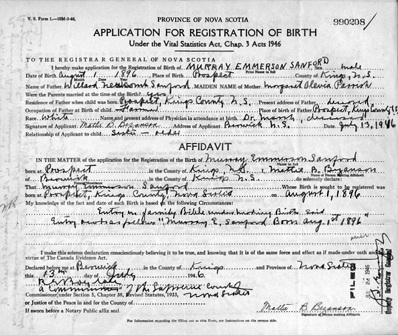 Parents Father: SANFORD, Willard Newcomb Mother: PARRISH, Margaret Olivia Birth Born on August 01, 1896 in Prospect, Kings Co., NS Death Died on 1982 Buried in Sandy Hill Cemetery in Belnan, Hants Co., NS Marriages ATKINSON, Ruth Winnifred Married on November 26, 1921 in Berwick, Kings Co., NS Notes Occupation: Farmer Sources Hants Cemeteries: Sandy Hill Cemetery Belnan,NS Images Murray Sanford Birth Murray Sanford Murray Sanford Marriage