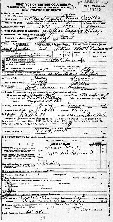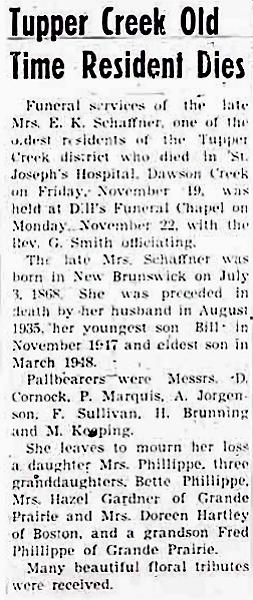 Birth Born on July 03, 1868 in Albert Co., NB Death Died on November 19, 1948 in Dawson Creek, Peace River Region, BC Buried in Dawson Creek City Cemetery in Dawson Creek, Peace River Region, BC Marriages SCHAFFNER, Arthur Steven Dewolfe Married on December 22, 1887 in Williamston, Annapolis Co., NS Children SCHAFFNER, Lawrence Bernard: May 07, 1889 - March 14, 1948 SCHAFFNER, Willoughby K,: August 03, 1890 - November 04, 1947 SCHAFFNER, Blanche Winnifred: December 06, 1900 - May 14, 1968 SCHAFFNER, Trevor Dewolf: April 04, 1908 - January 02, 1909 Notes Marriage Notice: m. Williamton, N.S., 22nd inst., by Rev. J.T. Eaton, Arthur S. SHAFFNER / Evangeline KINNIE d/o late Oliver KINNIE of Hopewell Hill (Albert Co.) N.B. Saint John Globe Saint John,NB December 31,1878 Death: Heart Block/ Myocardial Fibrosis Sources BC Deaths: #11415 Images Evangeline (Kinnie) Schaffner Death Evangeline (Kinnie) Schaffner Obit