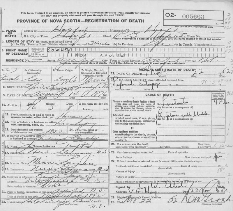 Parents Father: TUFTS, Major Judson Mother: LANGILLE, Minnie Elizabeth Birth Born on August 14, 1876 in New Germany, Lunenburg Co., NS Death Died on November 22, 1952 in Halifax, Halifax Regional Municipality, NS Buried in Aylesford Union Cemetery in Aylesford, Kings Co., NS Marriages BOWLBY, Frederick Chipman Married on February 15, 1911 in Aylesford, Kings Co., NS Children BOWLBY, Leslie Kenneth: September 10, 1918 - January 27, 1989 Notes Death: Peritonitis/ Ruptured Gall Bladder Sources Nova Scotia Deaths: Year 1952 Pg. 5663 Images Ada Tufts Birth Ada (Tufts) Bowlby Ada (Tufts) Bowlby Death Frederick Bowlby Marriage