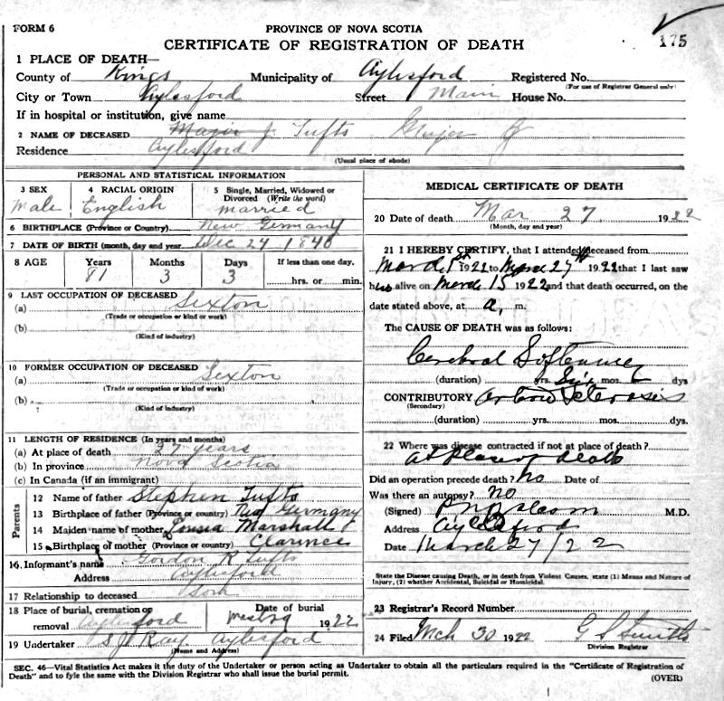 Birth Born on December 24, 1840 in New Germany, Lunenburg Co., NS Death Died on March 27, 1922 in Aylesford, Kings Co., NS Buried in Aylesford Union Cemetery in Aylesford, Kings Co., NS Marriages LANGILLE, Minnie Elizabeth Married on May 20, 1876 in Bridgewater, Lunenburg Co., NS Children TUFTS, Ada Louise: August 14, 1876 - November 22, 1952 Notes Occupation: Farmer/ Sexton Death: Cerebral Softening Sources Berwick Register: April 12, 1922 Nova Scotia Deaths: Book 93 Pg. 175 Images Major tufts Death Major Tufts Marriage