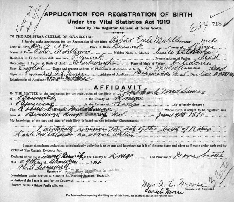 Parents Father: MIDDLEMAS, Peter Mother: ATKINS, Cecelia Birth Born on January 19, 1890 in Berwick, Kings Co., NS Death Died on May 24, 1965 in Berwick, Kings Co., NS Buried in Berwick Cemetery in Berwick, Kings Co., NS Marriages NORWOOD, Myrtle Edith Adelia Married on July 25, 1911 in Berwick, Kings Co., NS Children MIDDLEMAS, Charles Robert: August 19, 1912 - 1980 Notes Occupation: Blacksmith Death: Acute Myocardial Infarction Sources Nova Scotia Deaths: Year 1965 #4199 Images Robert Middlemas Birth Robert & Myrtle (Norwood) Middlemas Robert Middlemas Death Myrtle Norwood Marriage