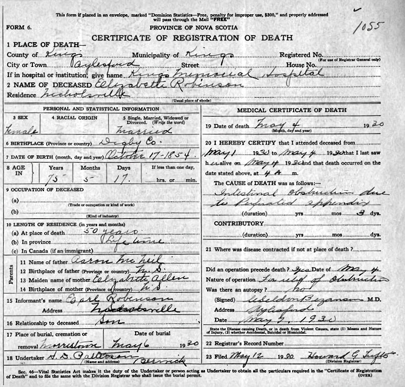Birth Born on October 17, 1854 in St. Mary's Bay, Digby Co., NS Death Died on May 04, 1930 in Aylesford, Kings Co., NS Buried in Morristown Cemetery in Morristown, Kings Co., NS Marriages ROBINSON, Asaph Beriah Married on July 01, 1880 in Aylesford, Kings Co., NS Children ROBINSON, Vernon Cecil: September 12, 1887 - May 28, 1953 Notes Death: Perforated Appendix Sources Nova Scotia Deaths: Book 126 Pg. 1055 Images Asaph & Elizabeth (Hallett) Robinson Elizabeth (Hallett) Robinson Death Asaph Robinson Marriage