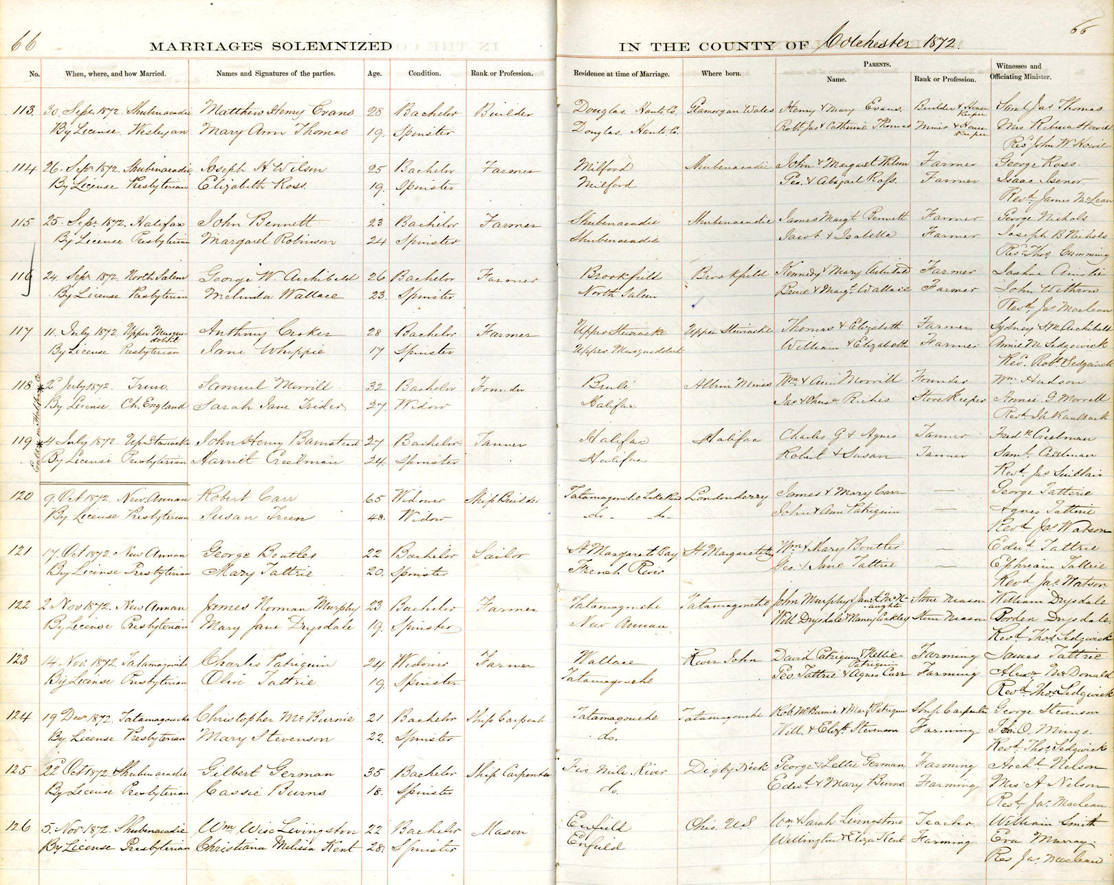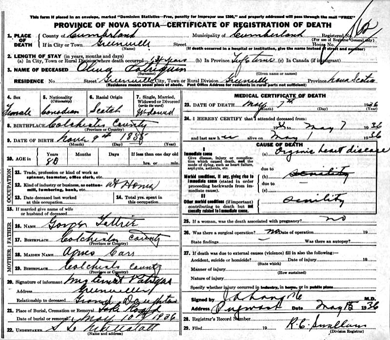 Parents Father: TATTRIE, George Mother: CARR, Agnes Birth Born on November 09, 1855 in Lake Road, Colchester Co., NS Death Died on May 07, 1936 in Greenville, Cumberland Co., NS Buried in Lake Road Cemetery in Lake Road, Colchester Co., NS Marriages PATRIQUIN, Charles W. Married on November 14, 1872 in Tatamagouche, Colchester Co., NS Children PATRIQUIN, David Henry: May 03, 1876 - July 05, 1954 Notes Death: Organic Heart Disease Sources Nova Scotia Deaths: Book 167 Pg. 162 Images Charles & Olevia (Tattrie) Patriquin Charles & Olivia (Tattrie) Patriquin Olivia (Tattrie) Patriquin Death Charles Patriquin Marriage