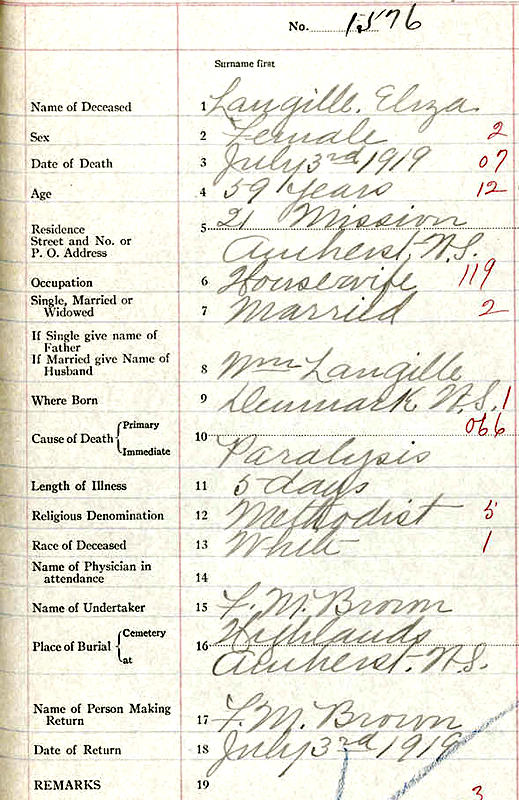 Birth Born on July 16, 1860 in Denmark, Colchester Co., NS Death Died on July 03, 1919 in Amherst, Cumberland Co., NS Buried in Highland Cemetery in Amherst, Cumberland Co., NS Marriages LANGILLE, William C. Children LANGILLE, Alfred William: February 24, 1883 - June 29, 1964 LANGILLE, Edith: August 17, 1888 LANGILLE, Minnie A.: October 17, 1892 - August 25, 1919 LANGILLE, Effie Elversa: March 29, 1894 - March 04, 2004 Notes Death: Paralysis Sources Nova Scotia Deaths: Book 39 Pg. 401 #1576 Images Elizabeth (Joudrey) Langille Death