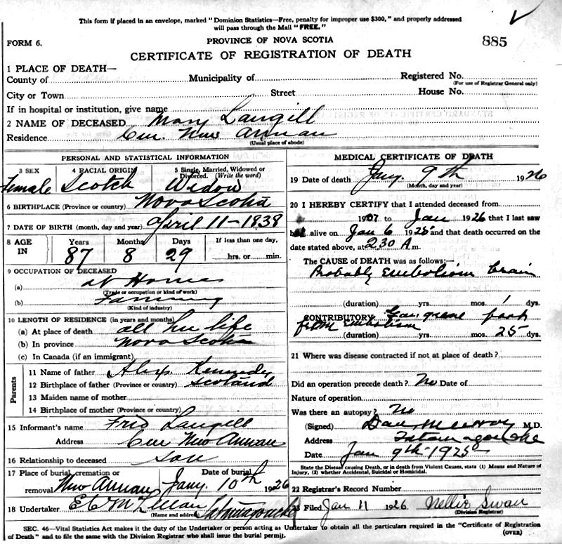 Birth Born on April 11, 1838 in New Annan, Colchester Co., NS Death Died on January 09, 1926 in Central New Annan, Colchester Co., NS Buried in Bell Gift Cemetery in West New Annan, Colchester Co., NS Marriages LANGILLE, Joseph Married on 1857 in New Annan, Colchester Co., NS Children LANGILLE, William: October 27, 1867 - April 13, 1958 Notes Death: Probably Brain Embolism Sources Nova Scotia Deaths: Book 112 Pg. 885 Colchester Cemeteries: West New Annan Bell Gift Cemetery #172 Images Joseph & Mary (Kennedy) Langille Mary (Kennedy) Langille Death