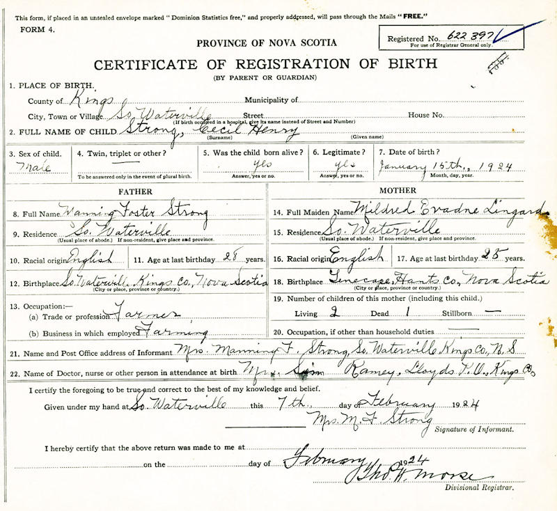 Parents Father: STRONG, Manning Foster Mother: LINGARD, Mildred Evadne Birth Born on January 15, 1924 in South Waterville, Kings Co., NS Death Died on 1978 Buried in Cambridge United Baptist Cemetery in Cambridge Station, Kings Co., NS Sources Kings Cemetery Records: Cambridge Cemetery Images Cecil Strong Birth George & Cecil Strong