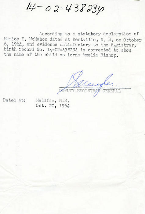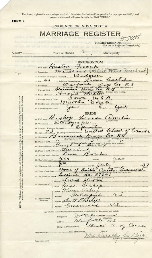 Parents Father: BISHOP, George Lovett Watson Mother: BOWLES, Laura Burgess Birth Born on July 09, 1914 in Greenwich, Kings Co., NS Death Died on 2002 in Kings Co., NS Buried in Willow Bank Cemetery in Wolfville, Kings Co., NS Marriages HUSTON, Francis Alphonsus Married on July 08, 1937 in Greenwich, Kings Co., NS Notes Occupation: Stenographer Sources Kings Cemetery Records: Willow Bank Cemetery Wolfville,NS Images Lorna Bishop Birth Lovett & Lorna Bishop Birth Francis Jr & Lorna (Bishop) Huston Lorna Bishop Marriage