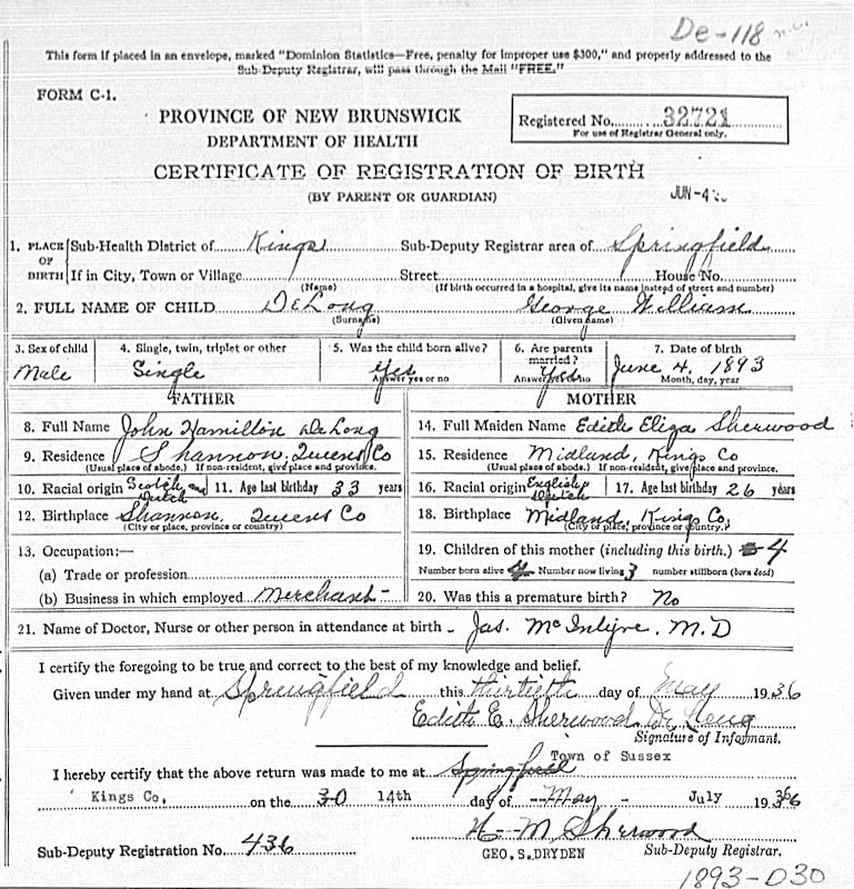 Parents Father: DELONG, John Hamilton Mother: SHERWOOD, Edith Eliza Birth Born on June 04, 1893 in Springfield, Kings Co., NB Death Died on April 04, 1975 in Shannon, Queens Co., NB Buried in Shannon Cemetery in Shannon, Queens Co., NB Marriages FOWLER, Estella Josephine Married on September 10, 1919 in Hampton, Kings Co., NB Children DELONG, Gordon Fenwick: January 20, 1922 - September 03, 2007 DELONG, Mary Elizabeth: July 22, 1923 - August 19, 2019 DELONG, Donald McCrea: February 01, 1925 - 2001 DELONG, William Sherwood: January 20, 1926 - December 30, 1993 DELONG, George Myles: April 11, 1927 - September 29, 2009 DELONG, John Hamilton: September 29, 1928 - 2012 DELONG, David Frederick: 1933 Sources Findagrave.com: http://www.findagrave.com/cgi-bin/fg.cgi?page=gr&GRid=98201018 Images George Delong Birth George W. & Estella (Fowler) Delong Estella Fowler Marriage