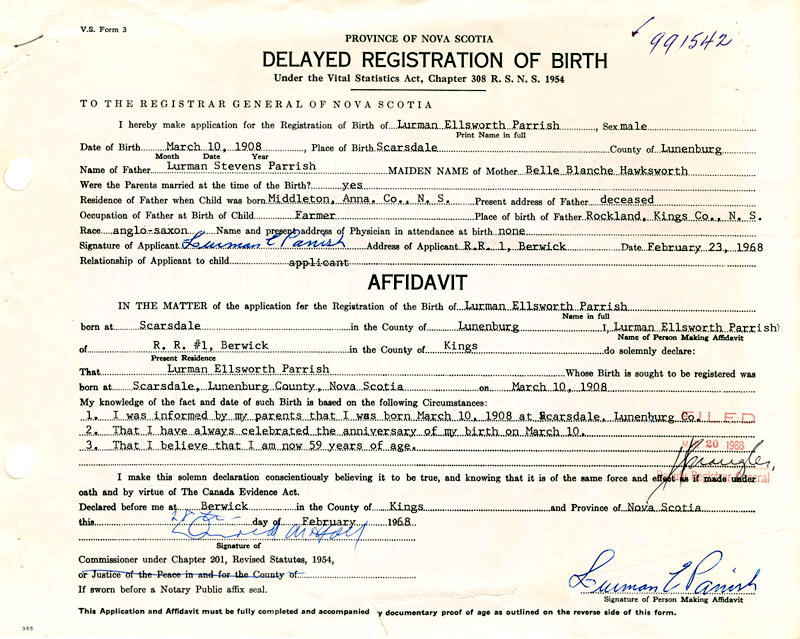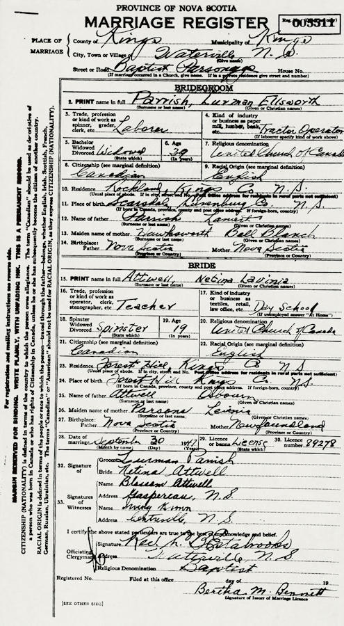 Parents Father: PARRISH, Lamert Stevens Mother: HAWKSWORTH, Belle Blanche Birth Born on March 10, 1908 in Scarsdale, Lunenburg Co., NS Death Died on September 05, 1986 in Berwick, Kings Co., NS Buried in Berwick Cemetery in Berwick, Kings Co., NS Marriages ATTWELL, Netina Lavinia Married on September 30, 1947 in Waterville, Kings Co., NS WARD, Ardyth Lorena Married on June 03, 1931 in Berwick, Kings Co., NS Notes Occupation: Farmer Sources Findagrave.com: https://www.findagrave.com/memorial/277052869/lurman-ellsworth-parrish Images Lurman Parrish Birth Lurman Parrish Marriage2 Lurman Parrish Marriage