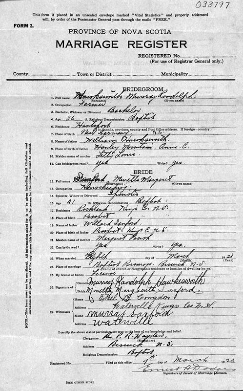 Parents Father: HAWKSWORTH, William Young Mother: LOHNES, Maria Letitia Birth Born on January 30, 1894 in Scarsdale, Lunenburg Co., NS Death Died on 1963 in Waterville, Kennebec Co., ME Buried in New Harrington Cemetery in Bristol, Lincoln Co., ME Marriages SANFORD, Minetta Marguerite Married on March 08, 1920 in Berwick, Kings Co., NS Children HAWKSWORTH, Lena Esther: August 05, 1921 - January 14, 1989 HAWKSWORTH, Mary Pauline: March 21, 1924 - December 02, 1992 HAWKSWORTH, Randolph M.: March 03, 1930 - July 29, 2004 HAWKSWORTH, Shirley Irene: April 09, 1931 - December 15, 1983 HAWKSWORTH, Phyllis M.: 1937 HAWKSWORTH, James William: March 17, 1940 - September 03, 2008 Notes Occupation: Farmer/ Road Construction Worker Sources New Hampshire Births: Lincoln County News Newcastle,ME October 10,1963 Images Minetta Sanford Marriage