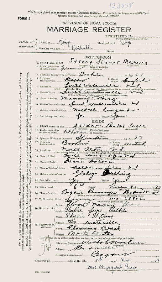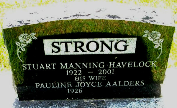 Parents Father: STRONG, Manning Foster Mother: LINGARD, Mildred Evadne Birth Born on January 23, 1922 in South Waterville, Kings Co., NS Death Died on July 29, 2001 Buried in Cambridge United Baptist Cemetery in Cambridge Station, Kings Co., NS Marriages AALDERS, Pauline Joyce Married on November 06, 1943 in Kentville, Kings Co., NS Children STRONG, Catherine STRONG, Victor Ervin STRONG, Gerald STRONG, David STRONG, Cameron STRONG, Larry Sources Findagrave.com: https://www.findagrave.com/memorial/168961946/stuart_manning_haverlock-strong Images Stuart Strong Birth Stuart & Pauline ((Aalders) Strong Stuart Strong Marriage