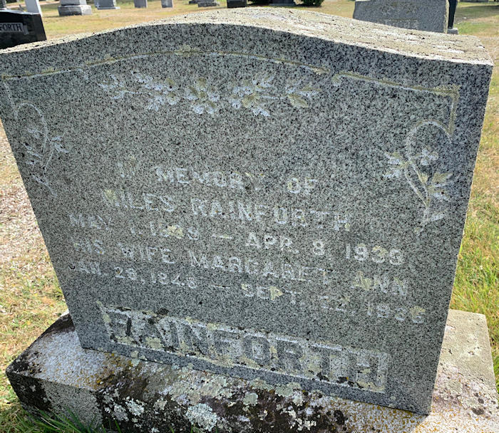 Birth Born on May 01, 1839 in Windermere, Kings Co., NS Death Died on April 08, 1939 in Windermere, Kings Co., NS Buried in Berwick Cemetery in Berwick, Kings Co., NS Marriages McKENZIE, Margaret Ann Married on July 15, 1869 in Berwick, Kings Co., NS Children RAINFORTH, Hannah Elizabeth: June 02, 1870 - August 17, 1945 RAINFORTH, Ermina Anna: January 13, 1872 - May 01, 1947 Notes Obituary: Berwick Register April 12, 1939 "The death of Miles Rainforth, an aged and highly esteemed resident of Windermere, occurred at his home at an early hour Saturday morning, April 8th. Had he lived until May 1st he would have reached the century mark. Born at Windermere in 1839, a son of the late George and Hannah Tupper Rainforth, he was the eldest of a family of four and the last to survive. In 1869 he married Miss Margaret Ann McKenzie of Windermere who predeceased him two and a half years ago, their married life having extended over sixty-eight years. Of this union there were six children, all of whom settled in this vicinity: Orland and Frank, Mrs. Aubrey Dodge, Mrs. Robert Palmer, Mrs. George Hutchinson and Mrs. George Fancy. The first break in the family circle came with the death of Mrs. Rainforth in September, 1936. Mr. Rainforth was a man of vigorous health and keen intellect, retaining his mental faculties to his last hours. He was a successful farmer and orchardist. He cleared the woods and built his house, the first house on the Hall Road, when a young man and gradually built up a large and valuable farm. When about eighty years of age, he retired from active work, his son Frank taking over the homestead farm. He was a man who was greatly respected in the community, a good neighbor and kind friend. Funeral services were held from his late residence on Sunday afternoon with his pastor, Dr. D. J. MacPherson, of Berwick United Baptist Church, officiating. Interment was at Berwick, pall-bearers being four grandsons, Miles Palmer, Hartley Hutchinson, Lorimer and Hazen Rainforth. Survivors besides the five children are fourteen grandchildren, twenty-seven great-grandchildren and one great-great-grandchild." Occupation: Farmer Marriage Notice: Berwick Register July 17, 1935 "Celebrate Sixty-Sixth Wedding Anniversary -- Mr and Mrs Miles Rainforth, Berwick West, two of the oldest residents of the vicinity, celebrated their 66th wedding anniversary at their home on Monday. Mr and Mrs Rainforth, whose ages are 96 and 87 years respectively, are still active and enjoy a fair degree of health. They were married July 15, 1869, at the home of the bride's parents, the late Mr and Mrs S McKenzie, Berwick. Their children are all living and reside within a short distance of the old homestead. They are: Mrs Aubrey Dodge, Mrs Robert Palmer, Mrs George Hutchinson, Mrs George Fancy, Orland and Frank Rainforth." Sources Kings Cemetery Records: Berwick Cemetery Images Miles & Margaret (McKenzie) Rainforth Miles Rainforth Marriage