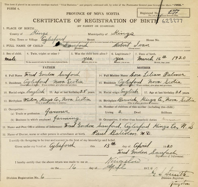 Parents Father: SANFORD, Frederick Gordon Mother: PALMER, Cora Lillian Birth Born on March 16, 1920 in Weston, Kings Co., NS Death Died on January 19, 1999 in Berwick, Kings Co., NS Buried in Berwick Cemetery in Berwick, Kings Co., NS Marriages KENNEDY, Ruth Hope Married on September 10, 1938 in Aylesford, Kings Co., NS Children SANFORD, Wayne L. SANFORD, Donalda: April 25, 1939 SANFORD, Ivan Gordon: January 21, 1944 - June 05, 2015 Notes Occupation: Farmer Sources Kings Cemetery Records: Berwick Cemetery Berwick,NS Images Robert Sanford Birth Robert & Ruth (Kennedy) Sanford Robert Sanford Marriage Robert Sanford