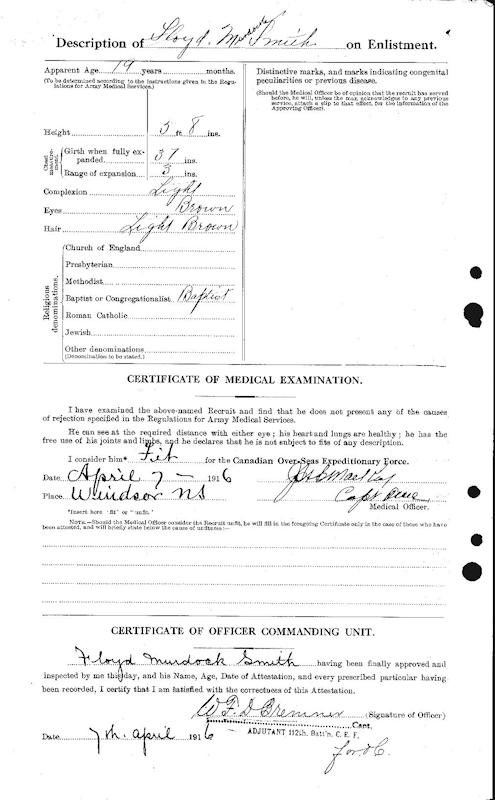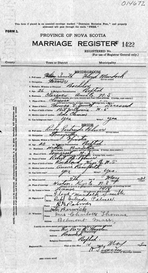 Parents Father: SMITH, Thomas Ephraim Mother: CLEMM, Ida Eugenia Birth Born on August 09, 1896 in Clarence, Annapolis Co., NS Death Died on May 14, 1990 Buried in Fairview Cemetery in Lawrencetown, Annapolis Co., NS Marriages PALMER, Ruby Gertrude Married on May 09, 1923 in Weston, Kings Co., NS Children SMITH, Allison Palmer: June 20, 1924 - July 12, 1959 SMITH, Ronald Eugene: August 25, 1925 - April 14, 1945 Notes Occupation: Farmer Military Service: WW1 CEF Captain Sources Findagrave.com: https://www.findagrave.com/memorial/209377375/floyd-murdoch-smith Images Floyd & Ruby (Palmer) Smith & Allison & Marie (Gillis) Smith Floyd Smith Floyd Smith Death Ruby Palmer Marriage Floyd Smith WW1 Attestion1 Floyd Smith WW1 Attestion