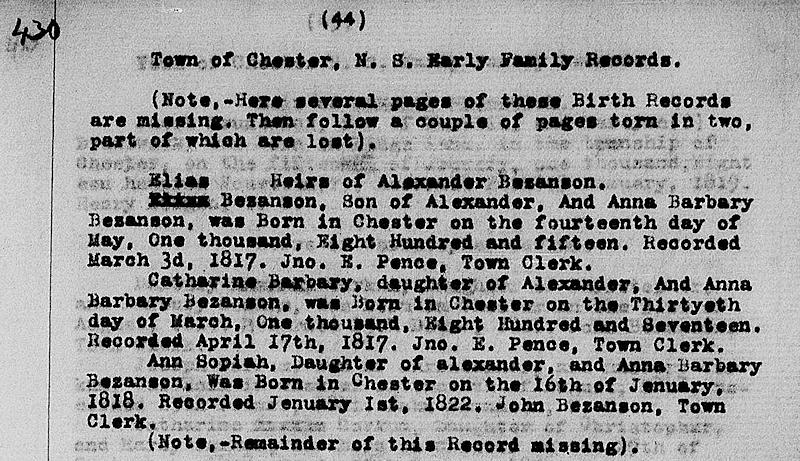 Birth Born on May 14, 1815 in Chester, Lunenburg Co., NS Death Died on February 13, 1903 in New Ross, Lunenburg Co., NS Buried in United Baptist Cemetery in New Ross, Lunenburg Co., NS Marriages HILTZ, Ann Elizabeth Married on November 07, 1839 in Chester, Lunenburg Co., NS Children BEZANSON, Benjamin: 1841 - July 10, 1915 BEZANSON, William: January 22, 1848 - November 27, 1935 Images Elias Bezanson Birth Elias & Ann (Hiltz) Bezanson Elias Bezanson Marriage